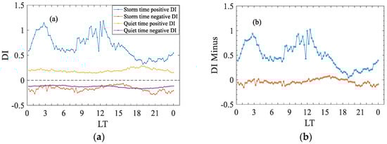 To better show the geomagnetic effect on τ, Figure 6a presents the comparison of the quiet-time DI index and storm-time DI index. It is of great importance to note that the DI index in Figure 6a is the same as the mean DI index in Figure 5. As can be seen from the figure, the storm-time DI index has a greater range of variation than the quiet-time DI index. The storm-time positive DI index is larger than the quiet-time positive DI index in all periods, and it is particularly significant in the period from midnight to sunrise and around noon. The storm-time negative DI index has a more variable pattern compared to the quiet-time negative DI index. For most of the time, the storm-time negative DI index is smaller than the quiet-time negative DI index, except for the afternoon period from 12:00 to 15:00 LT when the storm-time negative DI index is slightly larger than the quiet-time negative DI index. Figure 6b shows the difference between the storm-time DI index and quiet-time DI index according to the sign of the DI index. As can be seen from the figure, the difference in the positive DI index is relatively small during the pre-sunset-to-evening period (17–23 LT), with the difference below 0.21. The difference is greater than 0.2 in all other time periods, reaching 0.93/1.02 at 02:45 LT/12:30 LT after midnight/around noon, respectively. On the other hand, the negative DI index difference is greater than -0.2 in all time periods, and even greater than 0 in the afternoon period, 12:00–15:00 LT, indicating that the negative disturbance during the storm is very weak. Therefore, we preliminarily conclude that the geomagnetic storm would enhance the τ at Yakutsk, especially for the τ in post-midnight-to-sunrise hours and noontime.