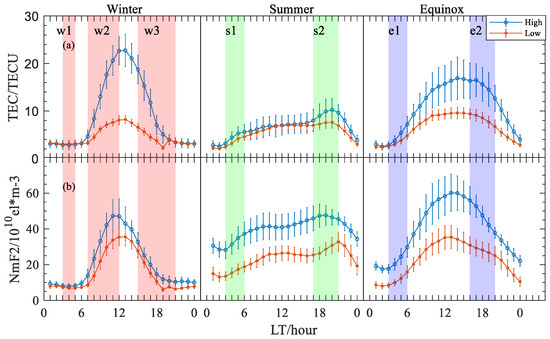 (a) The diurnal variation of median and standard deviation of TEC in winter, summer, and equinox of high- and low-solar-activity years. (b) The diurnal variation of median and standard deviation of NmF2 in winter, summer, and equinox of high- and low-solar-activity years.