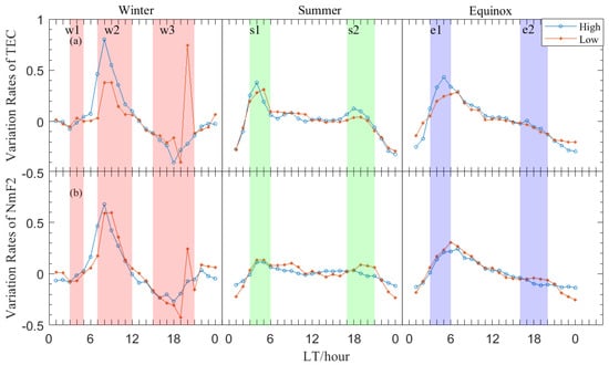 (a) Variation rates in TEC for winter, summer, and equinox in high- and low-solar-activity years, respectively. (b) Variation rates in NmF2 for winter, summer, and equinox in high- and low-solar-activity years, respectively.