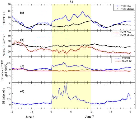 Figure 9 shows the variations of the DI index of TEC, NmF2, and τ during the period from 6 June 12 UT to 8 June 0 UT. Correspondingly, the TEC/NmF2 observations and their monthly median were also presented in Figure 9. It can be seen from the figure that there is an interrupted TEC increase in 0 UT on 7 June, resulting in a TEC positive disturbance that lasts for 12 h (S1 period). Meanwhile, the NmF2 observations are smaller than the corresponding monthly median, and there are negative disturbances of NmF2. Therefore, the τ increases markedly, and there are positive disturbances of τ during the s1 period.