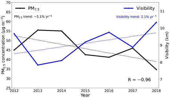 Annual mean visibility (blue line) and surface concentrations of PM2.5 (black line) in Seoul, South Korea, during 2012–2018.
