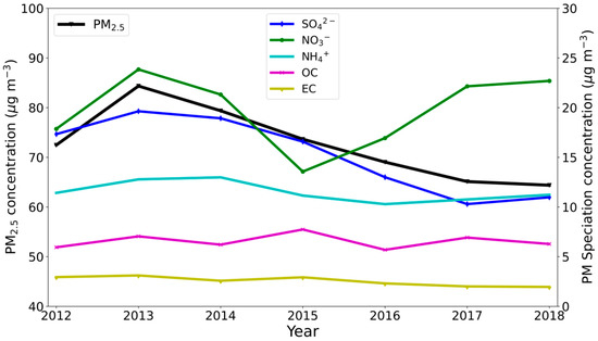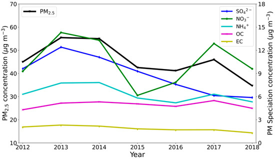 Annual mean concentrations of PM2.5, SO42−, NO3−, NH4+, OC, and EC concentrations in Seoul, South Korea, during 2012–2018.