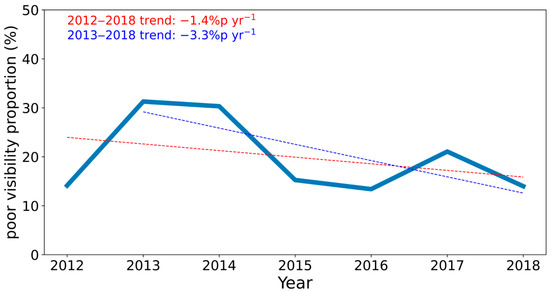 Annual mean poor visibility proportion in Seoul, South Korea, during 2012–2018. Note that the trends of 2012–2018 (red dotted line) and 2013–2018 (blue dotted line) are separated. Note that %p stands for % points.