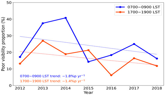 Annual mean poor visibility proportion during the morning (0700–0900 LST; blue solid line) and evening (1700–1900 LST; red solid line) rush hour periods in Seoul, South Korea, during 2012–2018. Note that the trends of the morning (blue dotted line) and evening (red dotted line) are separated and %p stands for % points.