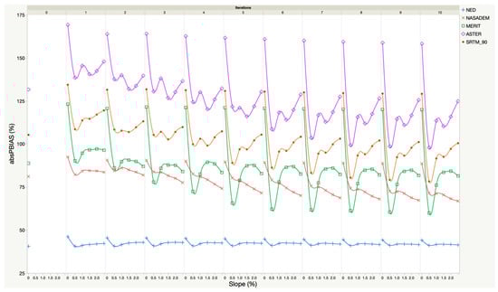 Average absPBIAS in FwDET2.1 water depth calculations for combination of number of iterations [0–10] (top X-axis) and slope threshold [0–2.5] (bottom X-axis) using NED, NASADEM, MERIT, ASTER, and SRTM_90 DEMs.