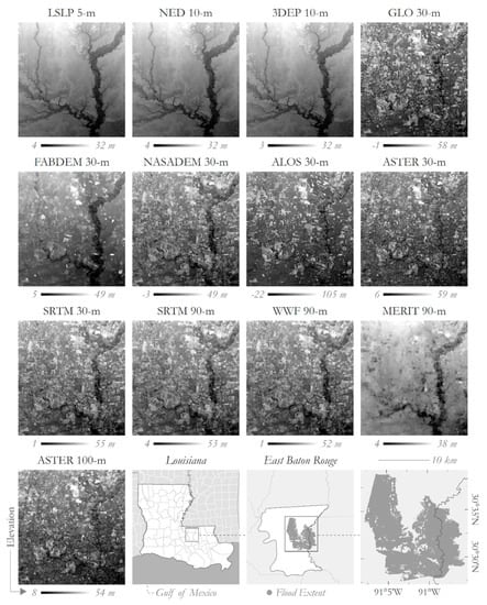 To analyze the effect of different DEMs on FwDET predictions, one of the USGS FIM case studies (Amite and Comite Rivers, Louisiana; case study #4 in Figure 1 and Table 1) was modeled using a comprehensive collection of DEMs ranging from 5 m to 100 m spatial resolution (Table 2). The GEE version of FwDET2.1 was used for this assessment without any filtering algorithms to test only the differences between the DEM products and not the effects of the filtering procedure. The Amite and Comite Rivers’ modeled flood extent covers an area of approximately 210 square kilometers and is situated in Central Louisiana near State Highway 64 and U.S. Highway 190. This flood was selected for this analysis as it is one of the largest of the 16 case studies, providing a better approximation of a typical remote sensing inundation mapping application; it is also a relatively continuous inundation extent (as opposed to fragmented), which is preferable for the FwDET algorithm.