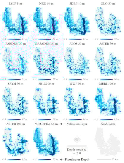 FwDET2.1-GEE was executed using each DEM and the outputs are illustrated in Figure 4. As expected, the granularity of the water depth estimation layers derived from each DEM corresponds with the granularity of the input dataset. LSLP 5 m, NED 10 m, and 3DEP 10 m match well visually with the terrain and the USGS FIM hydraulic model. Additionally, the water depth ranges correspond with the elevation ranges of each input DEM due to the FwDET2.1-GEE algorithm that uses elevation to calculate depth. The water depth range of MERIT (<1 to 13 m) corresponds with the depth ranges of LSLP (<1 to 11 m), NED (<1 to 11 m), and 3DEP (<1 to 11 m), as well as the USGS FIM hydraulic model (<1 to 10 m). FABDEM 30 m, the trees- and buildings-removed version of GLO 30 m, has a water depth range closer to the finer spatial resolution models than GLO 30 m. Of the 30 m resolution datasets, water depths derived from NASADEM 30 m and SRTM 30 m (<1 to 17 m) are closest to the USGS FIM hydraulic model. The estimated water depth range derived from ASTER 100 m, which was the coarsest DEM, also fell within a similar range of the 10 m and 30 m DEMs (<1 to 13 m).