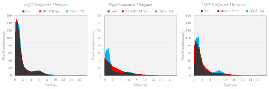 Depth histogram comparisons: 3DEP 10 m, NASADEM 30 m, and MERIT 90 m compared to USGSFIM 5.5 m. Depths were resampled at a 10 m spatial resolution for each dataset so that relative areas are comparable across datasets/charts.