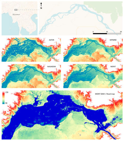 Region of interest for remote sensing case study; upstream Irrawaddy River in Myanmar (river flow is from east/right to west/left), including the four DEMs used for this case study and a flood map derived from Sentinel-1 imagery of 16 July 2019, overlaid on the MERIT DEM.