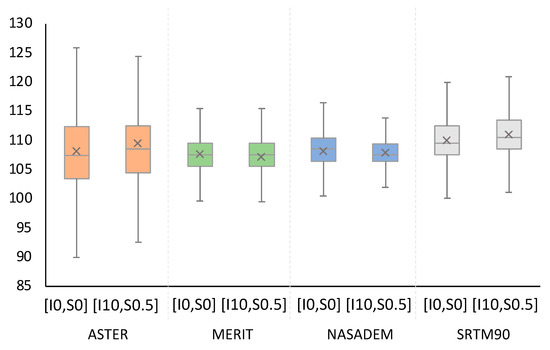 The location of the Irrawaddy River case study, the DEMs for this area, and the flood map derived from Sentinel-1 are shown in Figure 7. Figure 8 shows water level statistics over the entire flood domain, as calculated by FwDET2.1. The spread of water levels is highest with ASTER, followed by SRTM90, and is lower with both MERIT and NASADEM. [I10 S0.5] slightly reduces the spread compared to [I0 S0] for all DEMs. While the patterns between the different DEMs stay roughly the same, MERIT resulted the lowest spread in both cases. The interquartile range (Q3–Q1) for NASADEM and MERIT is within 5 m, which is reasonable for this area (over a length of roughly 60 km, the river drops approximately 8 m based on MERIT, as discussed in detail later). The full range of water level values (max-min) is large, being over 35 m for ASTER at [I0 S0], while the smallest range, found for MERIT at [I10 S0.5], was just below 15 m. These ranges are likely unrealistic. However, errors in the DEMs themselves, which, in a tropical mountainous area like this, can be in the order of 10–20 m [13,16,23] will likely have contributed to these biases.