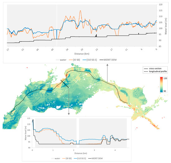 Longitudinal (top) and cross-section (bottom) profiles of the results of FwDET using MERIT DEM and flood map derived from Sentinel-1 imagery of July 16, 2019. The map shows water level results from FwDET2.1-GEE [I0 S0].