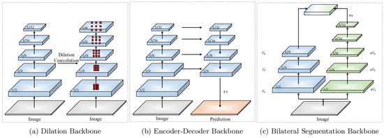 The predecessor of applying DCNNs in semantic segmentation is the fully convolutional network (FCN) [16]. It removes the last fully-connected layers in a DCNN. The later semantic segmentation methods keep improving based on the FCN. These successors mainly can be categorized into three types of architectures: (a) dilation backbone; (b) encoder–decoder backbone; (c) bilateral segmentation backbone. Their structures are shown in Figure 1 [10].