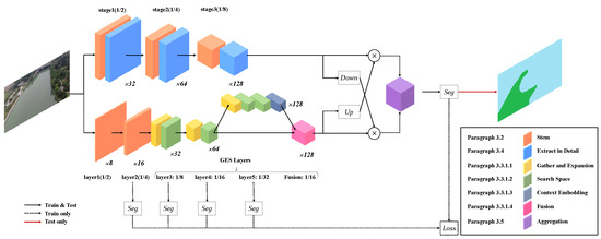 The upper path is the detail path and the bottom path is the semantic path. The detail path consists of Stages 1, 2 and 3. The semantic path consists of Layers 1, 2, 3, 4 and 5, and a fusion layer. Especially, Layers 3, 4 and 5 and the fusion layer constitute the gather–expand–search (GES) layer. The outputs of two paths are aggregated using bilateral guided aggregation. The network blocks are shown in the legend. Stem denotes stem block; Extract in Detail denotes feature-extraction operations in the detail path; GE denotes gather-and-expansion bottleneck; SS denotes search-space bottleneck; CE denotes context-embedding block; Fusion denotes feature fusion flock; Aggregation denotes bilateral aggregation module. Additionally, Seg head is the booster training strategy used in the training phases. Note that in 1 / {2, 4, 8, 16, 32}, the denominators denote the downsampling rate and ×8, 16, 32, 64, 128 denote the output channels.