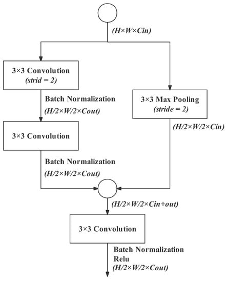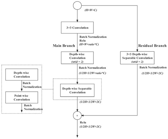 - Residual branch: The residual branch can restore the input information and protect the neural network from degradation [33]. In order to fuse with the main branch, the residual branch needs the same downsampling rate as the main branch. Therefore, a depth-wise separable convolution with a stride of 2 is performed in the residual branch. The downsampling operation is performed in the depth-wise convolution.