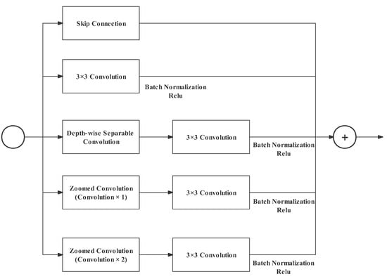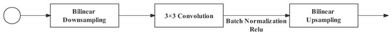 The search-space bottleneck aims to improve the accuracy of the result feature map of stages in the semantic path by enlarging the receptive field. The search-space bottleneck was first introduced in Auto-DeepLab [34] to optimize resolutions, and FasterSeg [32] designed the zoomed convolution for the search space. Zoomed convolution reduces 40% of the latency and doubles the receptive field [32] for a standard convolution. As shown in Figure 6, a zoomed convolution consists of one bilinear downsampling, one or more 3 × 3 convolutions, and a bilinear upsampling in sequence. Our design uses multiple parallel branches in the search-space bottleneck to integrate multi-resolution information. This design enables the search-space bottleneck to search for abundant information within the space and output a strong feature representation. In the search-space bottleneck, the size and the number of channels is kept stable. As shown in Figure 7, the parallel branches include:
