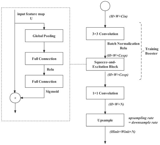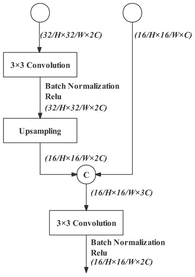 The structure of the feature fusion block is shown in Figure 10. The feature map of Layer 5 output is further extracted by a standard 3 × 3 convolution and then upsampled. It is restored to 16 downsampling rate for fusing with Layer 4’s output. Since the channel amount of Layer 5’s output (128 channels) is also double that of Layer 4’s output (64 channels), the concatenated result (192 channels) is triple that of Layer 4’s output. Therefore, a standard 3 × 3 convolution projects the result into the desired dimension—128 channels, the same as the result of the detail path.