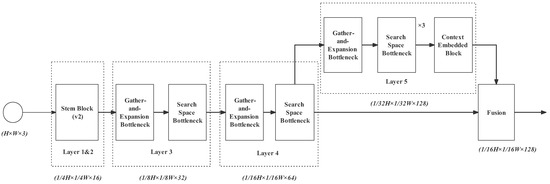 - Layer 5: gather-and-expansion bottleneck + three search-space bottlenecks. In this layer, the output channel is 128, and the downsampling rate is 32. In the case of a high downsampling rate, plenty of search-space operations are particularly needed for enlarging the receptive field effectively. It can also further extract feature representation while maintaining the feature map size. In Layer 5, we also add the context-embedding block at the end to embed the global contextual information;