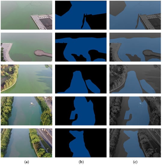 Raw images and masks in dataset. The first column titled (a) are the original images taken by UAVs. The second column titled (b) are the labels, with the blue areas representing blue-green algae. The third column titled (c) are the fused images, in order to clearly present the results; (a), raw images; (b), masks; (c), blends.