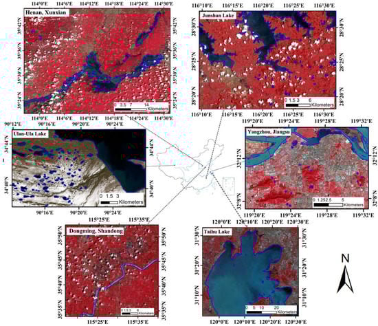 Spatial distribution of the research areas over China used for testing the SAR and Optical Imagery Water Index (SOWI) in this study.