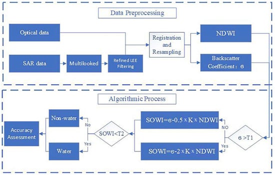 The framework in which SOWI was used to obtain the distribution of surface waterbodies in this study is shown in Figure 2 and can be described as follows. First, the preprocessed SAR and optical images are registered and then resampled to the same resolution. Based on certain rules, a threshold T1 is determined for each SAR image, the SAR image is preliminarily segmented according to T1, different coefficients K are assigned to the preliminary segmentation results, and the SOWI value is calculated. The threshold value method is used to determine the threshold of the operation result to obtain the distribution of the surface waterbody and the accuracy of the result is evaluated.
