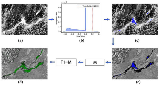 Threshold T1 calculation example: (a) Normalized Difference Water Index (NDWI). (b) Histogram of NDWI (red line represents the threshold). (c) Determined as waterbody according to the threshold in the NDWI histogram (blue area). (d) The same waterbody in the SAR image (blue area). (e) Preliminary determination of the water area in SAR images according to T1 (green area).
