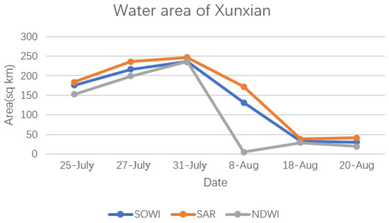 The flood area obtained by the three algorithms in each period was calculated in order to verify the effectiveness each algorithm for flood distribution monitoring. As can be seen from Figure 6, the areas extracted by the SOWI and SAR image threshold algorithms held the same trend over time, while that extracted by the NDWI algorithm based on optical imagery indicates that the water area changed greatly around 8 August. Most of the water areas in the optical image of 8 August were covered by clouds, resulting in a much lower flood area extracted by the optical image than by the other two algorithms. The water area extracted by the SAR image was higher than that extracted by the SOWI algorithm in each period. This is because the northwest terrain of this region is mainly mountainous and has great relief, which is represented as radar shadow in the SAR image, and so that region was mistakenly categorized as waterbody (Figure 5). However, the optical image is disturbed by clouds and fog, and thus, the water area was relatively small. It can also be seen from the figure that on 31 July, the difference between the water area extracted by the NDWI and SOWI algorithms is small. There is no cloud occlusion in the optical image on 31 July, and the water extraction accuracy was high, which is consistent with the water area extracted by the SOWI algorithm. By comparing the results of the different algorithms, it can be seen that the spatial and temporal distribution of the flood range extracted by the SOWI algorithm is consistent with the actual changes. The algorithm successfully used optical images to correctly identify radar shadows and reduce commission error, and utilized the SAR images to correctly obtain the range of water under the cloud and fog occlusion, thereby reducing omission error. This demonstrates that the SOWI algorithm is suitable for monitoring the distribution of flood waters during a flood outbreak.
