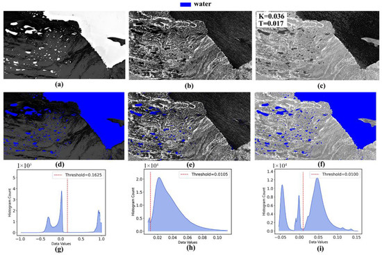 Waterbody extraction map for the Ulan-Ula Lake area under strong wind: (a) NDWI. (b) HH. (c) SOWI. (d) Water extraction based on the NDWI. (e) Water extraction based on VV. (f) Water extraction based on the SOWI. (g) NDWI histogram. (h) VV histogram. (i) SOWI histogram. The red lines in (g–i) represents the threshold.
