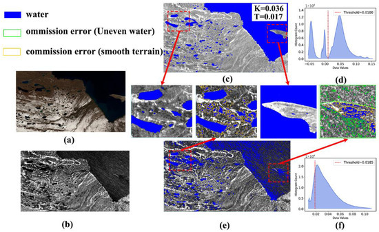 Waterbody extraction map for the for the Ulan-Ula Lake area under strong wind: (a) Optical image. (b) SAR image. (c) Water extraction based on the SOWI. (d) SOWI histogram. (e) Water extraction based on VV. (f) VV histogram. The red lines in (d,f) represent the threshold.