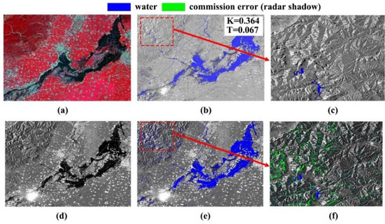 The imaging mode of optical images differs from that of SAR images [46]. Therefore, optical images tend to correctly reflect the spectral characteristics of ground objects in the radar shadow area. As shown in Figure 12, due to the occlusion of the mountain, the SAR image incorrectly extracts a large number of radar shadow areas as waterbodies, which would seriously affect the judgment of a disaster situation during flood monitoring, and thereby, limits its application in that field. In contrast, the SOWI algorithm can effectively reduce the misidentification of radar shadow areas as waterbodies and can accurately identify the distribution range of waterbodies during flood outbreaks.