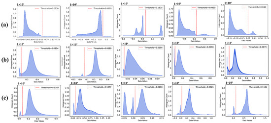 Comparison of histograms: (a) NDWI. (b) Co-polar band. (c) SOWI. In each panel, the red line represents the threshold.