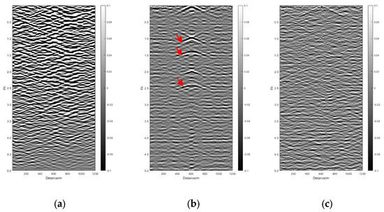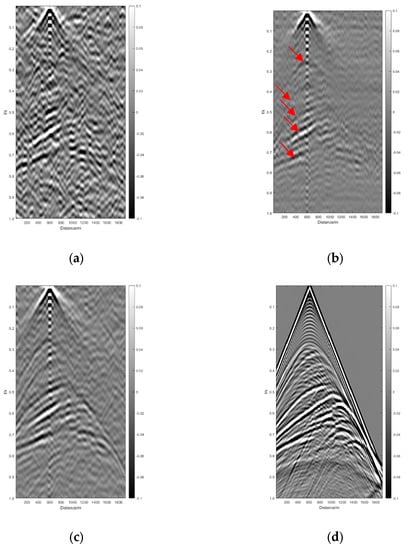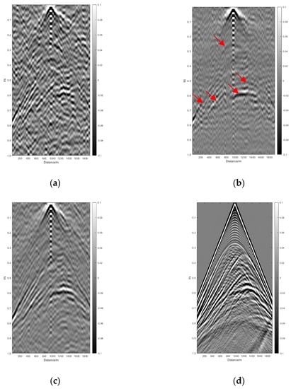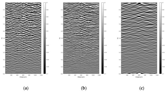 Two conventional methods process the results. (a) Small filter window median filter pro-cessing result; (b) large filter window median filter processing result; (c) f-k filtering processing re-sult.