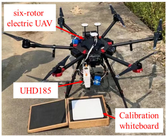 UAV hyperspectral remote-sensing operation and ground data acquisition were carried out simultaneously. A six-rotor electric UAV equipped with a UHD185 Firefly imaging spectrometer was used to obtain canopy hyperspectral data during the four potato growth periods (Figure 3). The UHD185 sensor is a non-scanning, full frame, real-time-imaging airborne spectrometer that measures 195 mm × 67 mm × 60 mm, weighs 470 g, and detects over a spectral range of 450–950 nm with 125 spectral channels, 4 nm per spectral sampling interval, 8 nm spectral resolution, and 12-bit digital resolution. All UAV flights were conducted under windless and cloudless conditions from 11:30 to 12:30 because the sun shines directly on the ground at this time and the light intensity is stable. The UAV flew at 20 m (the transect width was 6 m) and had a speed of about 1.5 m/s. To obtain high-quality hyperspectral images, the UAV’s heading and lateral overlap rates were 85% and 93%, respectively. The image capture interval was set to one second. The ground resolution of the resulting images was about 1.3 cm. Before each UAV took off, a black and white panel was used to radiometrically correct the canopy spectral reflectance.
