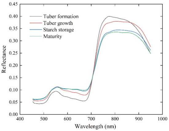Previous research has thus used UAV remote-sensing technology to estimate the growth parameters of wheat, rice, corn, soybean, and other crops in different phases. However, the structure and dry-matter accumulation process of potatoes differs significantly from that of other common crops, so additional research is required to accurately estimate potato AGB. Multiband crop canopy spectral information can be obtained through hyperspectral sensors with many narrow bands carried by UAVs, and the sensitivity of reflectance information and growth parameters varies across the different spectral bands. Therefore, AGB can be estimated by extracting characteristic spectral parameters. Due to the influence of the characteristics and the internal structure of crop leaves, the spectral reflectance of the crop canopy slowly increases and peaks within the 502–554 nm green-edge region, which differs significantly from the background features. Therefore, the sensitivity of characteristic spectral parameters in this area should be thoroughly examined to improve the accuracy of growth-parameter estimates.