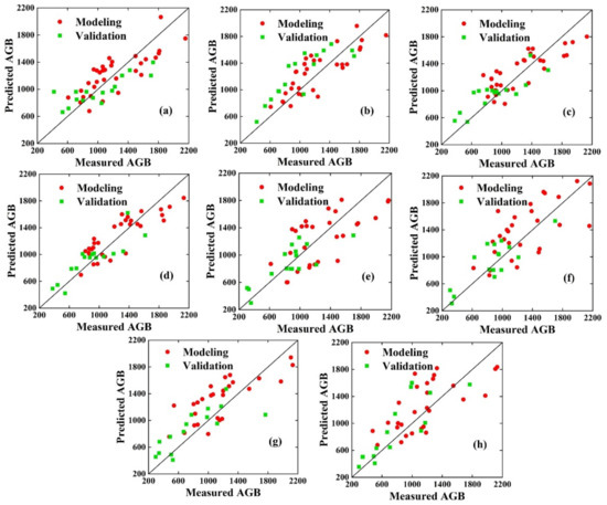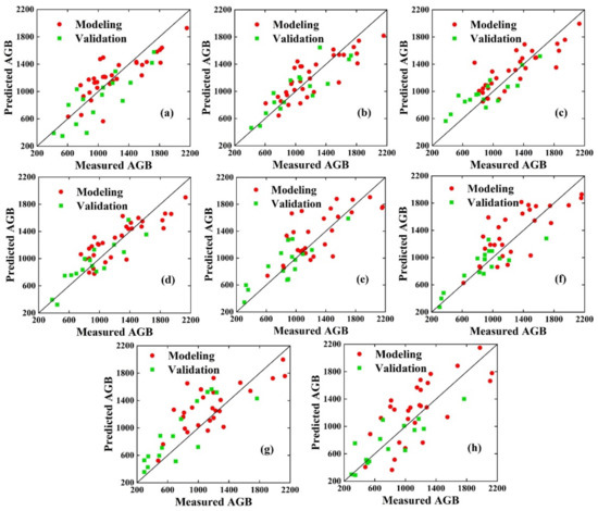 Relationship between measured and PLSR-estimated potato AGB (kg/hm2) at different growth stages: (a) VIs, (b) VIs and optimal GEPs (tuber form stage); (c) VIs, (d) VIs and GEPs (tuber growth stage); (e) VIs, (f) VIs and GEPs (starch storage stage); (g) VIs, (h) VIs and GEPs (maturity stage).