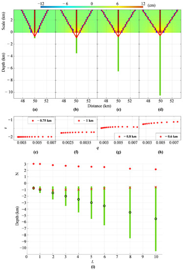 Vertical cylinder test. Multiscale methods applied to the vertical deformation generated by vertical cylinders with heights (a,e) L = 0.5 km, (b,f) L = 3 km, (c,g) L = 6 km, and (d,h) L = 10 km; vertical deformations are also shown at different scales z; blue and black dots point out the zeros of vertical (subset I) and horizontal (subset II) derivatives of the analyzed dataset, respectively, while the red solid lines are the best fit regression lines; the vertical sections of the sources are represented in green; red stars indicate τ = ∂ log (w)/∂ log (z) [−] in function of q = 1/z [km−1] using the source depth estimated by the Multiridge method, where w is the analyzed vertical deformation at the ridge subset II. (i) Multiscale results vs. L; the black circles point out the source centers, while the red crosses and stars indicate the estimates obtained through the Multiridge and ScalFun methods, respectively.
