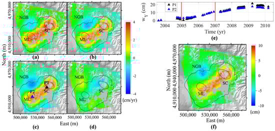 We analyze the ascending (Figure 2a) and descending (Figure 2b) LOS-projected mean deformation velocity maps, in which the deformation is referenced to a pixel in a stable north-western area (white square in Figure 2). Both orbits show that NGB moves away from the satellite, whereas SC and ML move closer to it, with a maximum deformation rate of cm/yr (Figure 2a,b). Subsequently, we derive the mean vertical (Figure 2c) and E-W (Figure 2d) velocity maps, highlighting a cm/yr deformation rate. The uplift episode affects SC and ML (Figure 2c), which move toward the east (Figure 2d), while NGB shows subsidence (Figure 2c) moving westward (Figure 2d). We focus our attention on the uplift of the resurgent domes and show the vertical deformation over time at P1 and P2 pixels (Figure 2e), which are nearby SC (black triangle in Figure 2c) and ML (blue triangle in Figure 2c). The uplift trend characterizes both these areas with different temporal rates, reaching vertical deformations greater than 20 cm at the beginning of 2009. Within the investigated period, we select a time interval characterized by a linear trend and higher velocity (red lines in Figure 2e), conditions that occur in the area of the resurgent dome during 2005–2007, where we observe a cm cumulative vertical deformation in two years (Figure 2f).