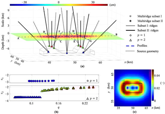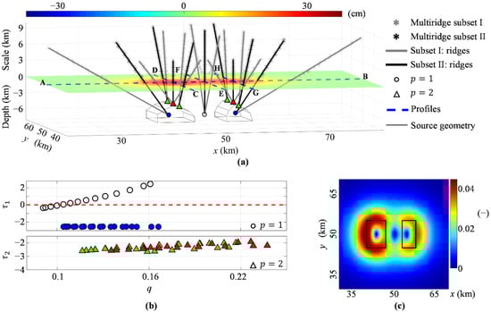 Multisource case. (a) Multiridge method applied to the vertical derivatives of orders 1, 2 of the simulated vertical deformation (horizontal slice). The results are displayed along with the AB (p = 1 and p = 2), CD (p = 2), EF (p = 1), and GH (p = 2) profiles with different symbols (see legend). (b) ScalFun method applied to the ridge subset II (fp) for both p = 1 (up) and p = 2 (down) cases; colored symbols indicate τp = ∂ log (fp)/∂ log (z) as a function of q = 1/z using the source depth estimated by the Multiridge method; z is the vertical scale. The red dashed line represents the value τ1 = 0. (c) THDw calculated on the simulated vertical deformation in (a); the black lines indicate the boundary of the sources. The map is generated by using Matlab R2018b software (https://it.mathworks.com/products/matlab (accessed on 1 November 2021)).
