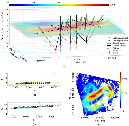 Yellowstone caldera case study. (a) Multiridge method applied to the 2005−2007 vertical deformation (p = 0) and its vertical derivative (p = 2). The horizontal slice shows the draped-to-flat continued field to a +4 km scale; the SRTM-DEM is also shown. The results are displayed along with the AB (p = 0), CD (p = 2), EF (p = 2), GH (p = 2), and IL (p = 2) profiles with different symbols (see legend); the orange and cyan dashed lines point out the range solutions, whereas the black dotted lines represent the projection of the ridges intersections. (b,c) ScalFun method applied to the ridge subsets II (fp) of p = 0 and p = 2 cases, respectively; colored symbols indicate τp = ∂ log (fp)/∂ log (z) as a function of q = 1/z using the estimate of source depth (squares and triangles) and its bound solutions (asterisks) by the Multiridge method; z is the vertical scale. (d) THDw calculated on the vertical deformation in (a). The map is generated by using Matlab R2018b software (https://it.mathworks.com/products/matlab (accessed on 1 November 2021)).