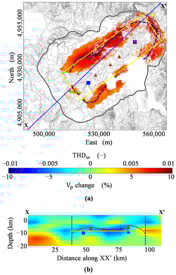 Yellowstone caldera source interpretation. (a) Boundaries and depth solutions of this study superimposed on the topography of the investigated area (grey contour lines). The blue line represents the P-wave velocity model’s XX’ trace, while the black line points out the caldera boundaries. The yellow star indicates the position of the HSB, and the dark blue dashed lines stand for the maxima alignments of THDw. The yellow rectangle points out the sill source solution redrawn from Delgado and Grandin [21]. (b) P-wave velocity model along the XX’ section (redrawn from Farrell et al. [1]) on which the boundaries and depth solutions of this study are projected. The dark blue and red dashed lines indicate the projection of the THDw maxima on the XX’ section and the interpretation of the top of the deformation source, respectively, while the yellow line is the projection along the same section of the sill source solution redrawn from Delgado and Grandin [21]. Blue squares and red triangles characterize Multiridge solutions with N~3 and 1 < N < 2, respectively. Figures are generated by using Matlab R2018b software (https://it.mathworks.com/products/matlab (accessed on 1 November 2021)).