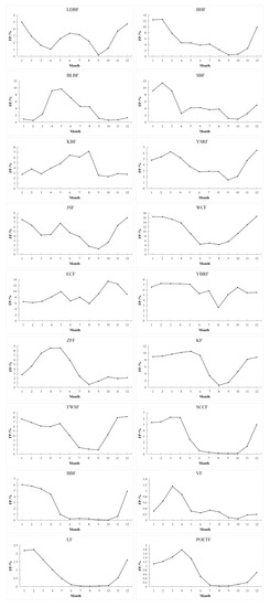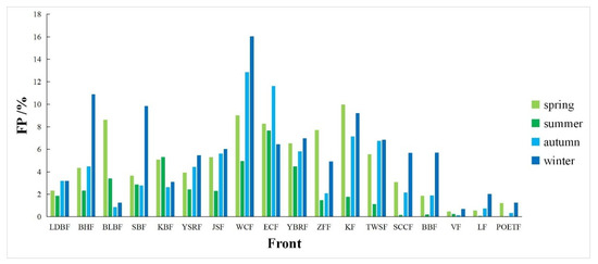 Figure 6 shows the FP value for each year from 1982 to 2021. Based on the average value of FP of each front in each year, the total average value of FP of each front is calculated and the results are shown in the last line of Table 3. According to the total average value of FP, the frontal frequency is divided into three grades which are low (<3%), medium (3–6%), and high (>7%). The results showed that there are three high-frequency fronts, which are the WCF (10.69%), ECF (8.51%), and KF (7.01%). Nine medium-frequency fronts, which are the YBRF (5.94%), BHF (5.48%), TWSF (5.06%), JSF (4.80%), SBF (4.76%), YSRF (4.05%), ZFF (4.04%), KBF (4.03%), and BLBF (3.54%). Six low-frequency fronts, which are the SCCF (2.75%), LDBF (2.64%), BBF (2.40%), LF (0.82%), POETF (0.70%), and VF (0.39%).