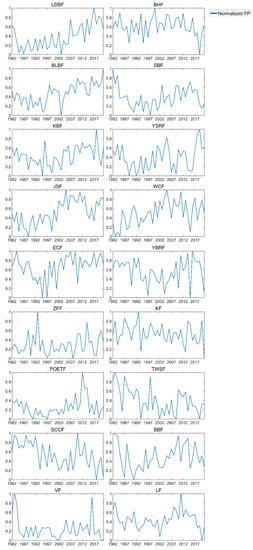In order to analyze the long-term change trends of the 18 frontal regions, we calculated the average FP value of each frontal region and performed normalization processing. The results are shown in Figure 7. According to the annual trend of the normalized FP value of each front, we found that fronts may be divided into three categories. The first type of front has a mainly upward trend, and the fronts belonging to this type are: LDBF, BLBF, JSF, WCF, KBF, YSRF, ECF, ZFF, POETF, and BBF. Among them, the fluctuation range of the front frequency of the LDBF, BLBF, JSF, WCF, KBF, ECF, and POETF after 2002 is higher than that before 2002. From 1996 to 2006, the frequency of the YSRF was dominated by an upward trend. From 2006 to 2016, the volatility trend on this front first decreased, then increased, and then decreased again. However, following 2016, the volatility trend of the YSRF increased once more. The upward trend of the fluctuations of the two fronts ZFF and BBF is gentler than that of the eight fronts mentioned above. The second type of front has a mainly downward trend, and the fronts belonging to this type are: TWSF, SCCF, BHF, YBRF, KF, and SBF. In comparison to the other three fronts, the lowering tendency of the frequency fluctuation of the TWSF and SCCF is more pronounced. After 2013, the downward trend in the frontal fluctuation of the BHF is more obvious. The YBRF fluctuated greatly after 1997. The downward trend in the KF volatility is moderate. The variability of the SBF was mostly characterized by a declining tendency between 1982 and 1991. After 1991, the volatility was dominated by a slow upward trend. The third type of front has neither an obvious upward trend nor a significant downward trend. There are two main types of fronts: VF and LF.