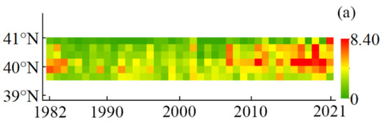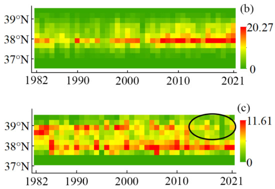 Figure 9 shows the Hovmöller diagram of the LDBF, BLBF, and BHF. Since 2011, the frequency of the LDBF between 40° and 41° N has been increasing. Since 2016, the LDBF has appeared almost every year (Figure 9a). The high-frequency region of the BLBF is mainly concentrated near 38° N. From 2007 to 2021, the frequency of the BLBF around 38° N also increased (Figure 9b). The average FP value of the BHF is higher than that of the LDBF and BLBF (Table 4). That means the frequency of the BHF is highest in the BS. However, its annual average FP value shows a slight decline (Figure 7). As shown in Figure 9c, after 2013 the frontal frequency north of 39° N decreases. As a result, the frequency of the BHF decreases.
