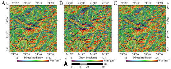 Direct irradiance simulation results over the Nanga Parbat Massif on 15 September 2022 at 10:00 a.m. (A). The green portion of the electromagnetic spectrum ( m). (B). The red portion of the electromagnetic spectrum ( m). (C). The near-infrared portion of the electromagnetic spectrum ( m). The direct irradiance is superimposed over using 50-percent transparency.