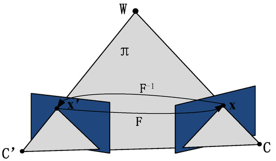 In Figure 1, the camera centers C and C’, a three-space point W, and image points x and x’ lie in a common plane π. A point, x’, in the first image is transferred via the common plane π to a corresponding point x in the second image. In symbols one may write x = Fx′ where F is the fundamental matrix (FM), and the other is x′ = F−1 x.