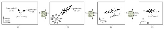 As we know, FM represents a transformation from the coordinate system centered at C’ to the other centered at C (Figure 1). Therefore, the FM F in Equation (1) is the linear transformation function between known corresponding points, and its eigenvectors are FM directions in 2D image space (Figure 3a). The covariance matrix can then be derived using matrix differentiation theory, which describes the FM error direction in 9D FM space in Figure 3b; herein, the eigenvector corresponding to the maximum eigenvalue of is the maximum variance direction of FM error. The FM can then be converted into Y or YF by the PCA method. Figure 3 is the specific conversion process from nine-element FM to two-element Y in a new 2D space and to one-element YF in a new 1D space.