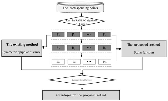 The symmetric epipolar distance is the most popular error criterion. This study analyzed the relationship between the scalar function YF and the symmetric epipolar distance Ed in Section 4.3. Compared with tests 1 and 2, test 3 had a higher linear relationship in Figure 8. The reason may be that there are many false corresponding points in tests 1 and 2, the Ed calculated with these corresponding points may be wrong or involve a large error, resulting in the incorrect estimation of FM. Therefore, false corresponding points affect Ed and the linear correlation coefficient of YF and Ed. Compared with Ed, the proposed method relies less on the accuracy, location, and number of known corresponding points, and is more robust and more reliable to evaluate FM error.