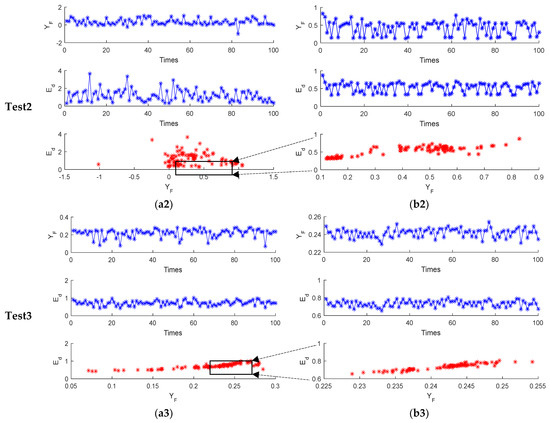 Distribution results of YF and Ed. There are the results of test1, test2, and test3 in (a1,b1), (a2,b2) and (a3,b3), respectively.