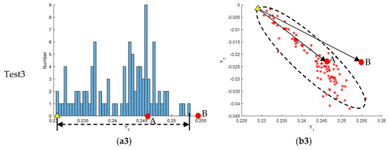 Statistical results. (a1,a2,a3) and (b1,b2,b3) are three groups of statistical histograms of YF and scatter plots of Y, which are calculated and counted from corresponding points removing false points in Figure 4(c1,c2,c3), respectively. In addition, the yellow triangles are the lower-bound points of the reasonable boundaries of YF and Y, respectively, and the red dots A and B are two YF or Y values corresponding to two different FMs.