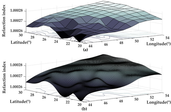 Atmospheric refraction index with a pressure of 1000 mb at noon on 1 March 2022. (a) The atmospheric refraction index of the NCEP GDAS/FNL 0.25 Degree Global Tropospheric Analyses and Forecast Grids (083.3). (b) The atmospheric refraction index after cubic spline interpolation.
