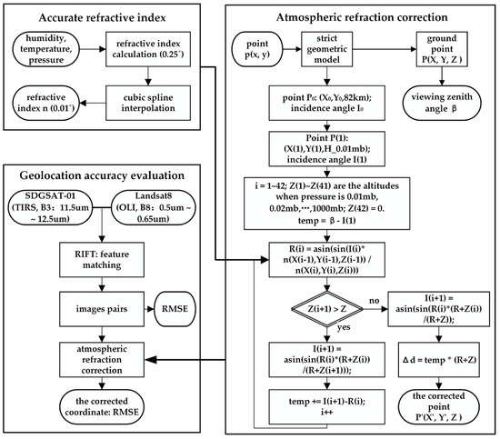 Figure 3 shows the flowchart of the geometric positioning with the proposed spatiotemporal atmospheric refraction correction method, and the detailed geometric process is shown in Figure 1b. The steps are as follows: